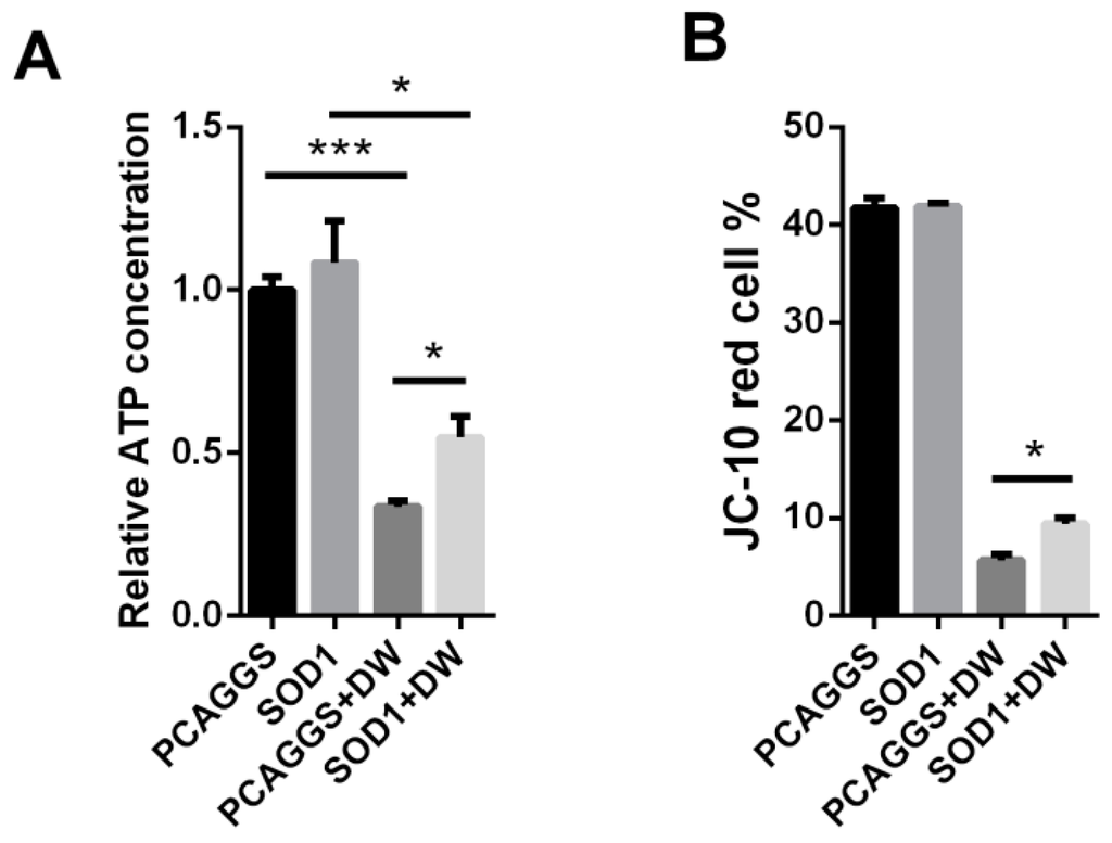 SOD1- and control-expressed cells were infected with DW at 1 MOI or control to detect ATP. The cells were lysed at 24 hpi, and ATP concentrations were determined using an ATP-Lite assay kit (Vigorous Biotechnology, Beijing, China) in accordance with the manufacturer’s instructions. Results were presented as relative ATP concentration.