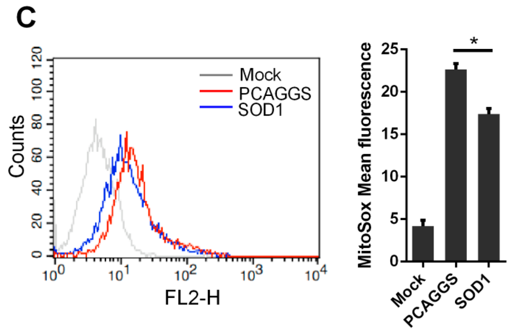 SODs are present in all cells in the body; these enzymes catalyze ROS detoxification and protect cells and tissues against oxidative stress. Extracellular superoxide dismutase (EC SOD) overexpression can prevent influenza-induced lung injury in mice by attenuating oxidative stress []. Cu/Zn superoxide dismutase (SOD1) was reported to be implicated in antioxidation in HCV-expressing cells []. SOD1 overexpression can reduce neurotoxic inflammatory signaling in microglial cells by altering ROS production []. It was also showed that SOD1 overexpression can inhibit H1N1 influenza virus replication in human alveolar epithelial cell line A549 []. Nevertheless, as H5N1 influenza viruses are more virulent agents that can lead to excessive cytokine secretion in infected mice and humans, it is of great interest to determine whether SOD1 overexpression can confer protection from H5N1 influenza viruses. This study demonstrates that H5N1 influenza virus infection can enhance ROS production to a greater extent than H1N1 influenza virus and that the former can induce intensive oxidative stress in A549 cells. Moreover, H5N1 infection increases the mRNA level of NADPH oxidases but reduces the mRNA and protein levels of SOD1. Forced SOD1 expression significantly decreases H5N1-induced ROS production and viral titer. This negative regulation of viral replication can be attributed to apoptosis inhibition, pro-inflammatory response attenuation, and protection against mitochondrial damage induced by H5N1 infection. Strategies targeting SOD1 may be an efficient way to control H5N1 infection.