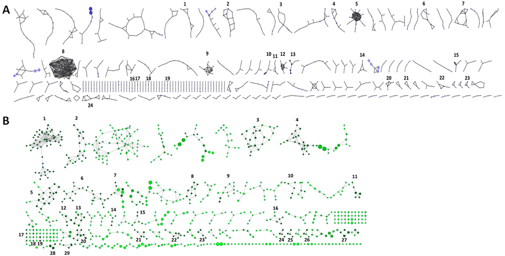Network representation of the contigs of the Gobabeb Saline (A) and Swakopmund Saline (B) metaviromes. Connections between the contigs (circles) are based on read pairs mapping to different contigs. The circle size is proportional with contig length and the darker the color (light to dark blue for GS, light to dark green for SS), the higher the coverage of the reads mapping to a specific contig. Contig networks containing at least one contig with coverage higher than 1000× were investigated and are numbered. Only the contigs connected to at least one other are shown.