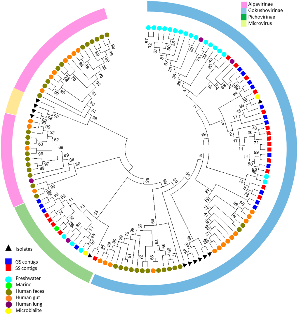 - Roux, S.; Krupovic, M.; Poulet, A.; Debroas, D.; Enault, F. Evolution and diversity of the Microviridae viral family through a collection of 81 new complete genomes assembled from virome reads. PLoS ONE 2012, 7, e40418. [Google Scholar] [CrossRef] [PubMed]