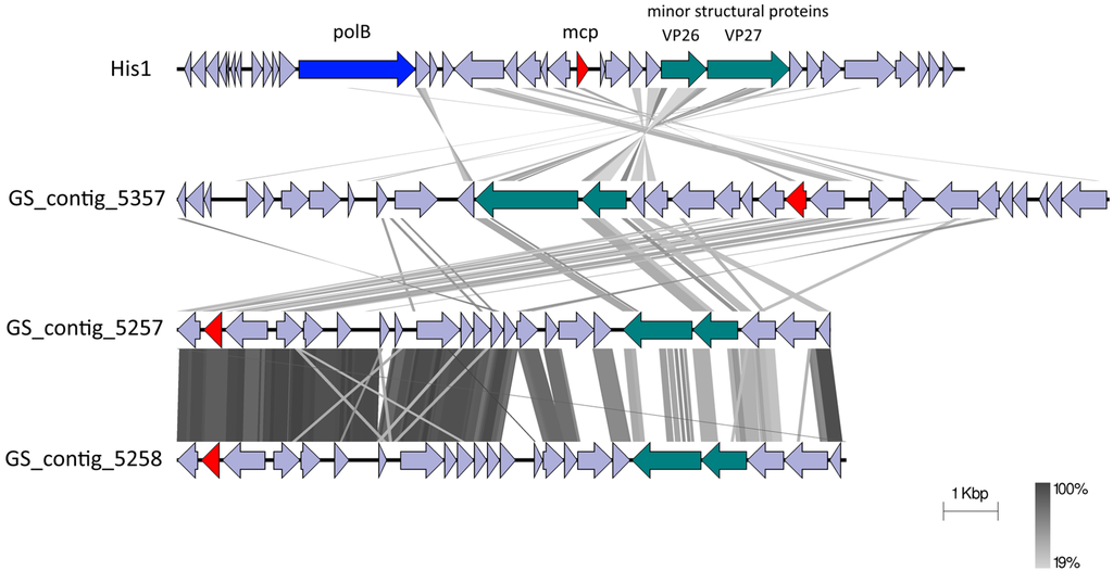 GS and SS contigs were annotated using the MetaVir pipeline, using MetaGeneAnnotator software [50] and BLASTx to the RefSeq virus database. In parallel, the same contigs were annotated by the VIROME pipeline using MetaGene [51] and BLASTp to the UNIREF100P [52] and MetaGenomes OnLine databases [41,53]. Annotated contigs of interest were downloaded from MetaVir as GenBank files. Additional annotations were found using the Conserved Domain search of NCBI [54]. The contig comparison figure of the salterproviruses was created using Easyfig [55] with tBLASTx for comparison and was annotated in Paint.net 4.0.5 (dotPDN LLC).