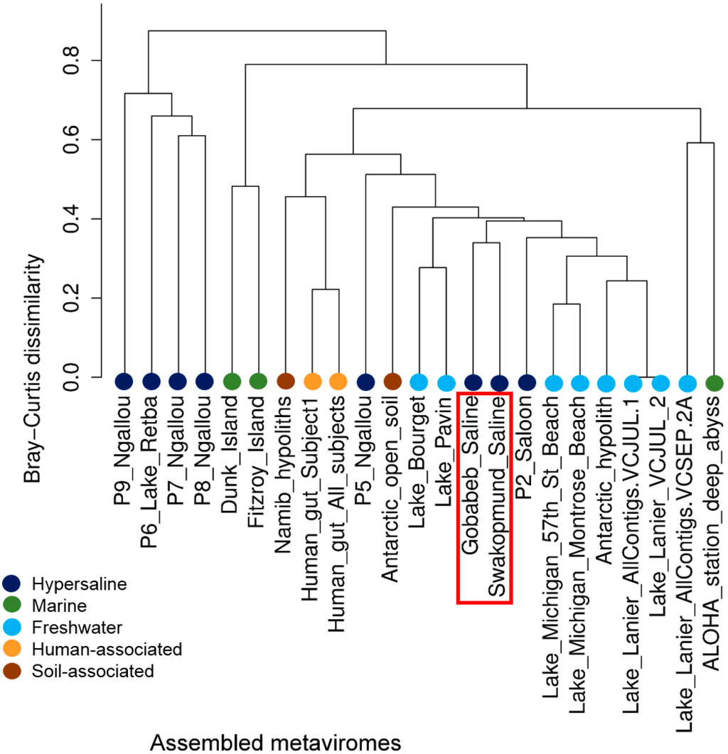 Cluster analysis of a Bray Curtis dissimilarity matrix based on the presence/absence of viral species in the investigated metaviromes as found by the MetaVir pipeline. Metaviromes were colored according to their biome. The Gobabeb Saline and Swakopmund Saline metaviromes are indicated with a red box.