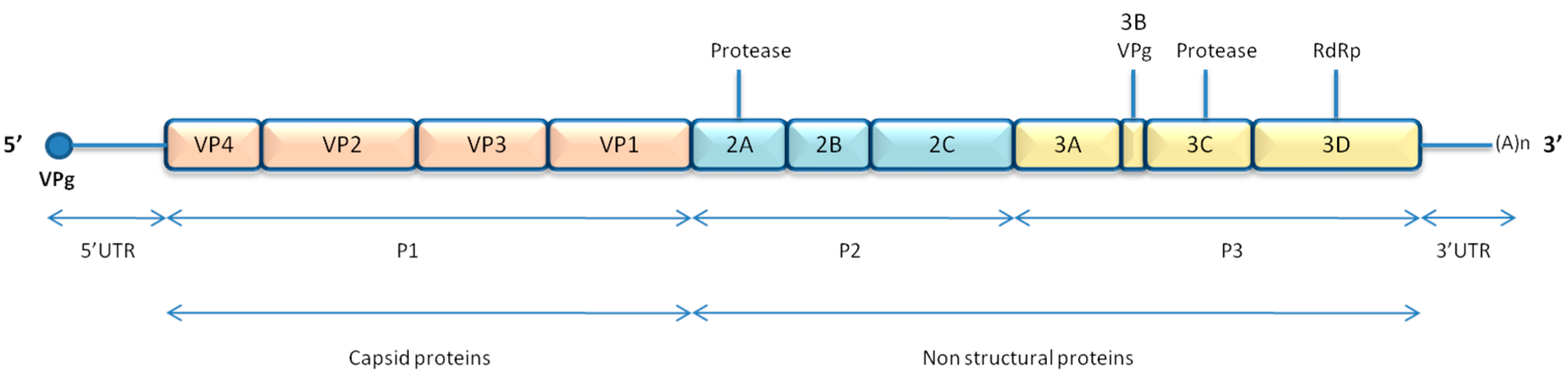 An internal ribosomal entry site (IRES) is located in the 5′untranslated region of the genome (5′UTR) and is necessary for translation. This translation gives rise to a precursor polyprotein, which is cleaved by viral proteases in 11 mature proteins. The single open reading frame is divided into three regions: the first region of the genome, P1, encodes for capsid proteins (VP1 to VP4), whereas the next regions, P2 and P3, give rise to non-structural proteins (2A to 2C and 3A to 3D) (Figure 1). Regarding structural elements, a cloverleaf structure is located close to the IRES in the 5′-UTR and a small stem loop in the 3′-UTR. Another stem loop structure, the cis-acting replication element (cre), is positioned at different places throughout the polyprotein coding region, depending on the viral species. A small viral protein, VPg, is covalently bound to the 5′ end of the genome, but seems to be cleaved from the genomic RNA early in the replication cycle. This protein is implicated in priming viral genome for replication, but recent studies have reported that its presence does not affect translation or replication [12,13]. Thus, it is unclear why this peptide is cleaved from genomic RNA shortly after its release in the cytoplasm, and it has been speculated that VPg unlinking may be necessary for proper encapsidation of newly synthesized genomic RNAs in particles as only VPg-containing viral RNA is found in virions [13].