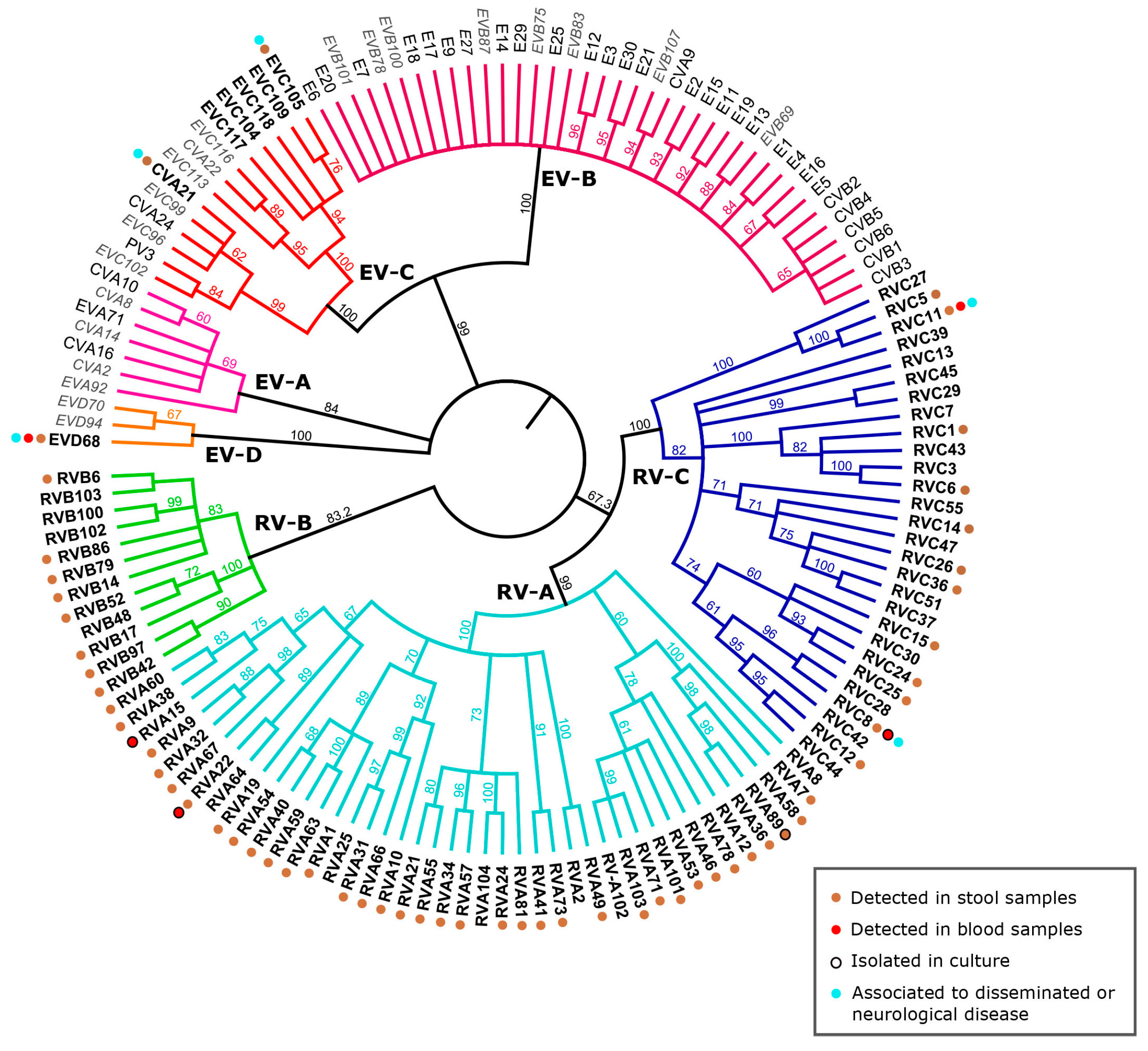 The EV genus belongs to the Picornaviridae family, which is composed of some of the simplest RNA viruses containing very limited genetic material. Despite this genomic size constraint, the Picornaviridae family displays a great variability between its different members and a very large number of types can be distinguished. Historically, EVs and RVs were classified into separate genera, but due to their closely related genome organization and structure, they were merged into a single genus named EV. This genus is divided into 12 species, based on the genetic homology and similarity of pathophysiology [102]. Seven of these species are composed of human pathogens: three RV species (RV-A, RV-B, RV-C) and four EV species (EV-A, EV-B, EV-C, and EV-D) (Figure 2). Formerly named human rhinovirus (HRV) and human enterovirus (HEV) species, the International Committee on Taxonomy of Viruses (ICTV) decided in February 2013 to abandon host names and renamed these species simply as Rhinovirus-A, B and C and Enterovirus-A, B, C and D [102,103]. Between 1956 and 1987, 101 different serotypes of RV were established based on serological cross-neutralization assays in cell culture [104] and were divided into species RV-A and RV-B [105]. Similarly, 66 human EV serotypes were defined until 1999 by serum neutralization. This method of classification was insensitive, time-consuming, and labor intensive and was restricted by the limited supply of standardized antisera [106] and the inability to isolate some EV or RV types in cell culture. A molecular typing system was developed in 1999 for EV, which relies on the sequencing of an amplicon targeting a variable part of VP1. To date, the accepted threshold for type assignment is >25% divergence in the VP1 coding region [107].