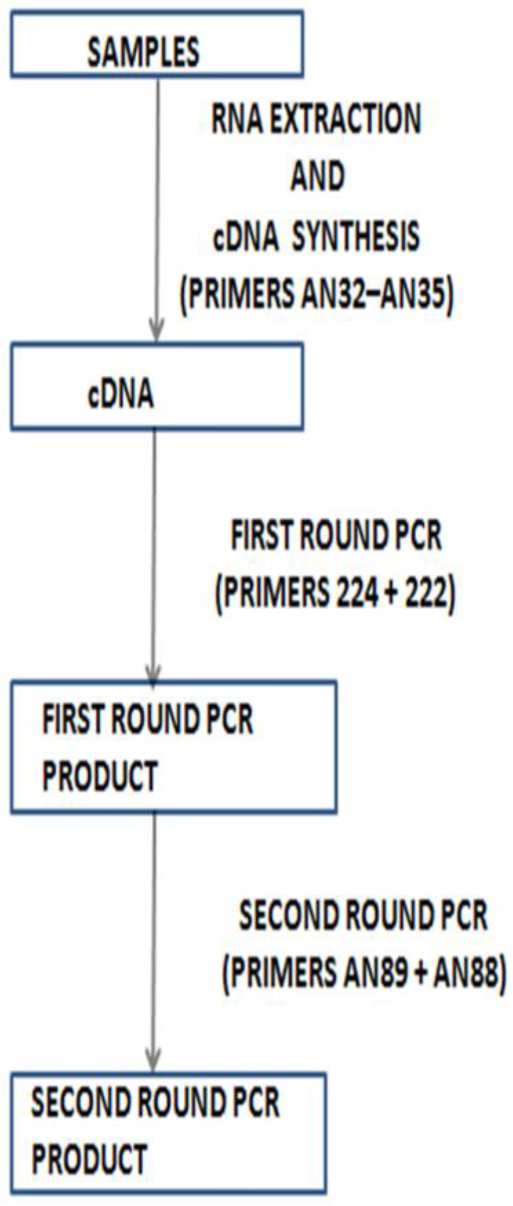 One strategy that has been proposed to overcome the impact of cell culture bias is direct molecular identification of enterovirus from clinical specimens using a reverse transcriptase semi-nested PCR (RT-snPCR) assay (Figure 2), and this has been documented to work []. This strategy has now been adopted officially by the World Health Organization (WHO) [] as an appendage to its previous cell culture-based strategy for enterovirus surveillance [,]. Considering the preponderance of enterovirus co-infections, should the genomic concentration have any impact on the final identity of mixed enteroviruses, then the enterovirus with the highest titer in clinical samples might consistently be identified. This phenomenon of mixed isolates bearing the identity of only one member of the mixture has recently been documented [,]. In fact, we have recently found that when the Nix et al. protocol is applied directly to clinical samples, enterovirus isolates that cannot be detected can subsequently be detected after the samples are first subjected to cell culture using a susceptible and permissive cell line []. This confirms that genomic concentration significantly impacts the enterovirus serotype detected by the Nix et al. protocol.