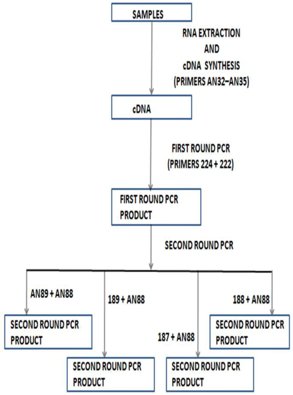 This shows that as much as molecular identification enables us to find and identify enteroviruses that would have been undetectable, an attempt to leave the cell culture-based algorithm behind, if not carefully managed, will also bias our view of the enterovirus diversity landscape. One of the ways in which we have tried to address this problem is by adding a species-specific screen using primers 187, 188 and 189 [,] to the second round PCR of the Nix et al. protocol []. Hence, instead of one second round PCR, there were four different second round PCR assays that use the same first round PCR product as a template (Figure 3). When this strategy was used to screen fecal samples and RD cell line isolates, either paired or not, we found a number of interesting things [,].