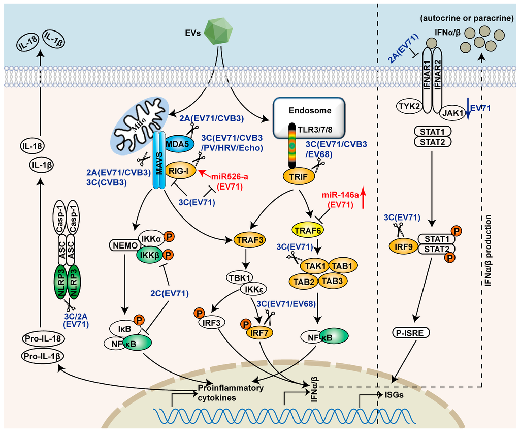 Evasion of PRRs-mediated signaling pathways by EVs. EVs target PRRs signaling pathways by non-structural proteins, 2A, 2C, and 3C. 2A cleaves MAVS and MDA5, and degrades IFNAR1. 2C inhibits NF-κB activation. 3C disrupts the RIG-I and MAVS complex, and cleaves TRIF, IRF9, IRF7, TAK1, and TAB1/2/3. The scissors represent cleavage. 3C also inhibits miR-526a-mediated RIG-I activation. EV71 can also evade innate immunity by inducing the expression of miR-146a.