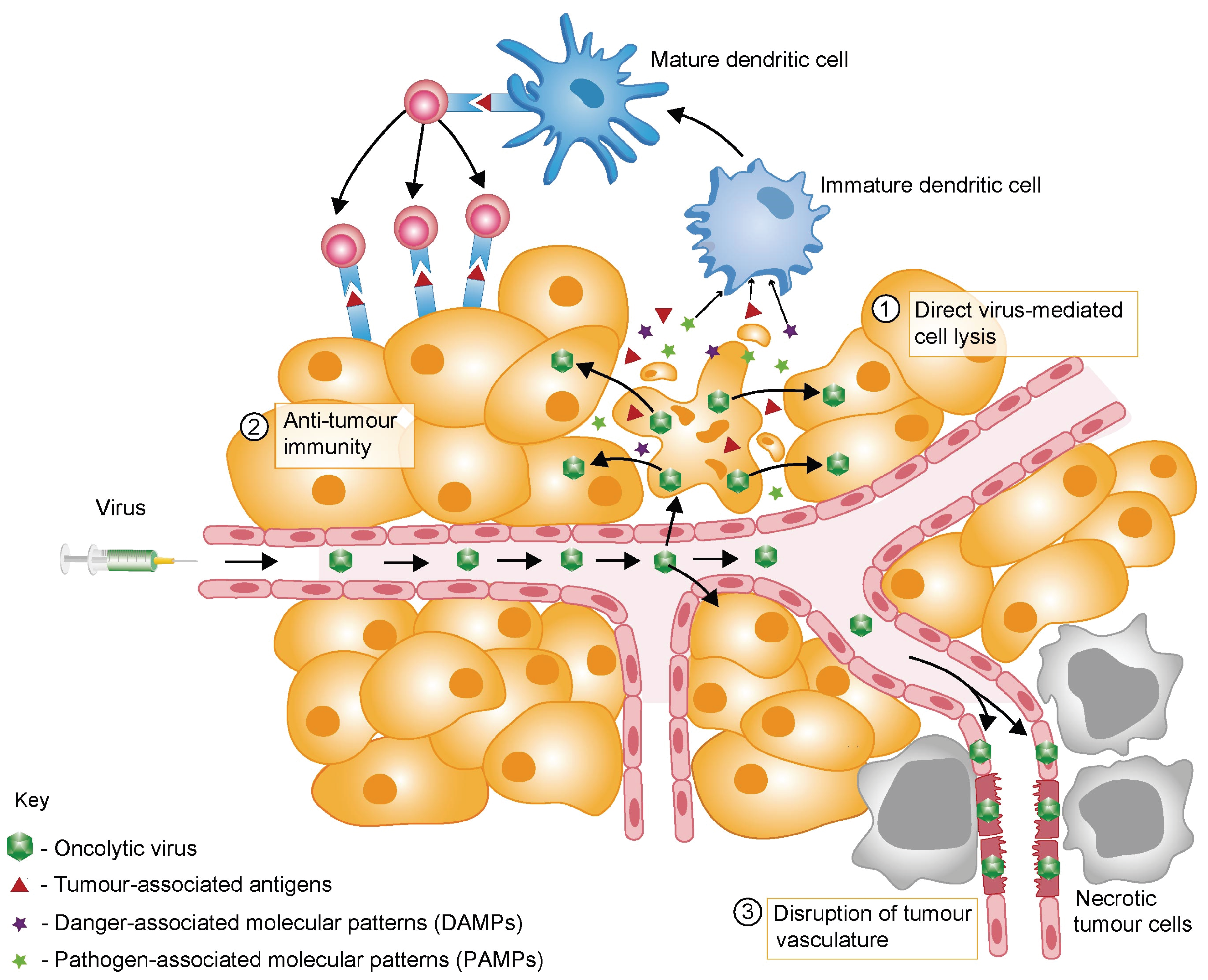 OV-mediated cell killing is also typically associated with the release of a repertoire of pathogen-associated molecular patterns (PAMPs). Characteristic PAMPs include viral components such as nucleic acids (DNA, dsRNA, ssRNA, and 5'-triphosphate RNA), proteins and capsid elements. DAMPs and PAMPs are recognised by pattern recognition receptors on innate immune cells and function as “danger” and “eat me” signals.These promote the maturation of antigen-presenting cells such as dendritic cells, and thereby the activation and expansion of antigen-specific CD4+ and CD8+T cells in the local tumour-draining lymph nodes (recently reviewed in [21]).