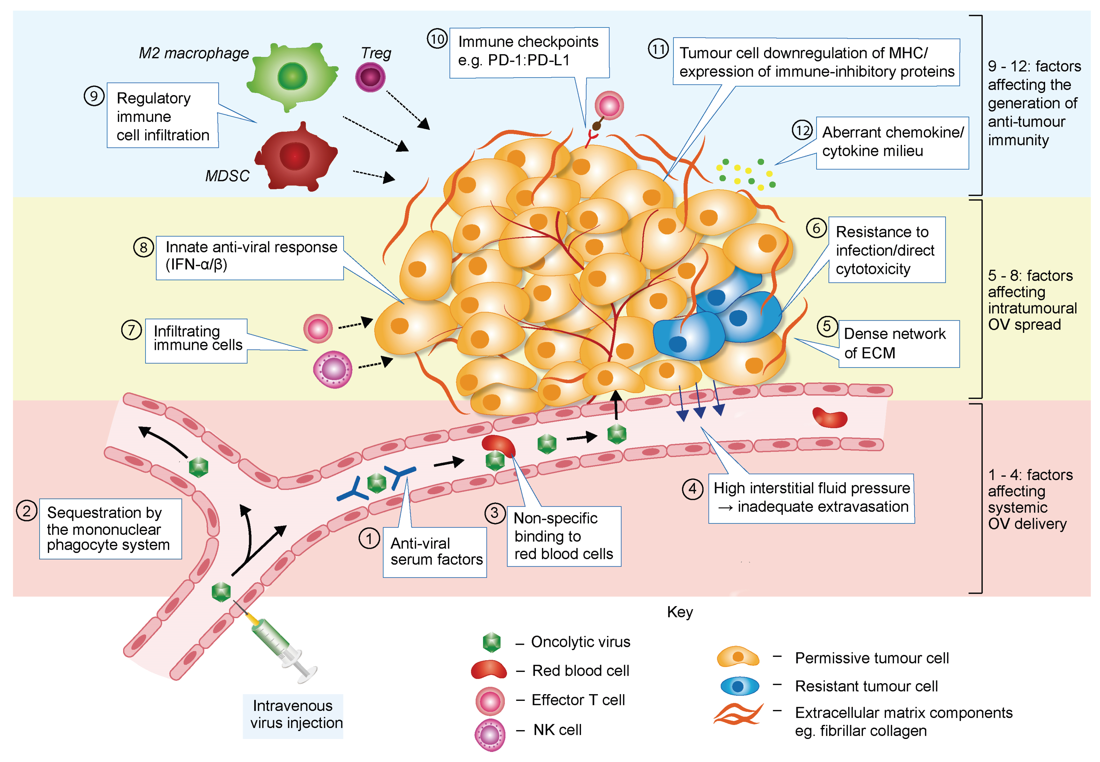 Barriers to effective OV therapy. When delivered to tumours via the bloodstream, oncolytic viruses (OVs) are vulnerable to anti-viral serum factors such as complement proteins and neutralising antibodies (box 1). Binding of these factors accelerates OV clearance from the circulation by macrophages in the liver, lungs and spleen (the mononuclear phagocyte system) (box 2). Systemic delivery of OVs may be further compromised by their non-specific binding to red blood cells (box 3). Once the target site is reached, an additional hurdle is posed by high interstitial fluid pressure within the tumour, which disfavours OV extravasation from the vasculature (box 4). Following extravasation, or after intratumoural OV injection, several factors may limit intratumoural viral spread and therapeutic effectiveness. Abundant extracellular matrix (ECM) and high interstitial fluid pressure represent physical barriers to OV spread by impeding virus diffusion between cells (box 5). Cancer cells within a tumour are likely to be heterogeneous in their susceptibility to virus infection and capacity to support the OV life cycle, with some cells displaying residual intracellular anti-viral activity and/or resistance to OV-mediated cell killing (box 6). Some viruses may also bind normal interstitial cells with a similar affinity as tumour cells, resulting in OV sequestration away from the target cancer cell (not illustrated in the figure). Infiltrating and resident innate immune cells (such as NK cells or macrophages) and anti-viral T cells will also contribute to limit the magnitude of viral production and spread (box 7). In some tumour cells (or normal stromal cells), virus infection may also trigger an anti-viral immune response, leading to release of type I IFN and impediment of virus multiplication (box 8). The immune-tolerant tumour microenvironment may hamper OV-induced anti-cancer immune responses in multiple ways (boxes 9–12), thereby limiting the efficacy of OV-based therapies.