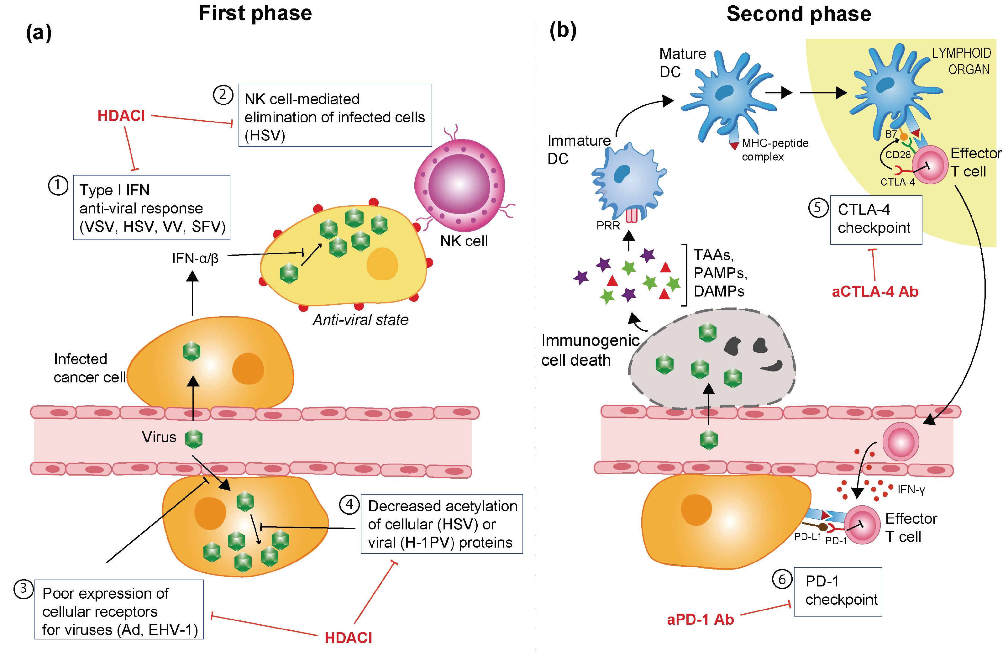 Combinatorial approaches to overcome barriers to OV-induced oncolysis and immune stimulation. (a) Multilevel stimulation of OV infection and multiplication by histone deacetylase inhibitors. The combinatorial use of HDACIs clears some of the hurdles (boxes 1–4) that limit the initial phase of the oncolytic virus (OV) oncosuppression process, i.e., virus infection and replication culminating in oncolysis and spread. OVs for which such stimulations have been reported are indicated in brackets (see main text) (b) Unmasking induced anti-tumour immunity by means of immune checkpoint inhibitors. As a result of a successful first phase of virus multiplication and tumour cell lysis (panel A), immune cells are activated and can target the tumour in a subsequent step of OV oncosuppression. This bystander effect is, however, counteracted by immune checkpoints acting in lymphoid tissues (box 5) or at the tumour site (box 6). In addition to its IFN-γ-mediated activation by effector T cells, the PD-L1/PD-1 checkpoint can be engaged as a result of OV infection of target tumour cells. The combined administration of immune checkpoint inhibitors, in particular specific antibodies (Ab), is intended to potentiate the immune stimulation achieved by OVs. Ad: Adenovirus; HSV: herpes simplex virus; EHV-1: equine herpesvirus type 1; H-1PV: H-1 parvovirus; SFV: Semliki Forest virus; VSV: vesicular stomatitis virus; VV: vaccinia virus; Ab: antibody; CD28: cluster of differentiation 28; CTLA-4: cytotoxic T-lymphocyte-associated protein 4; DAMPs: danger-associated molecular patterns; DC: dendritic cells; IFN: interferon; MHC: major histocompatibility complex; NK: natural killer cells; PAMPs: pathogen-associated molecular patterns; PD-1: programmed cell death protein 1; PD-L1: programmed death-ligand 1; PRR: pattern recognition receptor; TAAs: tumour-associated antigens.