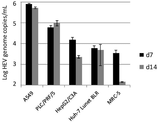 Replication of hepatitis E virus (HEV) strain 47832c in different cell lines. The mean HEV genome copy number present in the culture supernatant at 7 and 14 days (d) after inoculation and the standard deviation (error bars) of three replicates each are shown. For MRC-5 cells at day 14 after inoculation, HEV-RNA was only detectable in two of the three replicates.