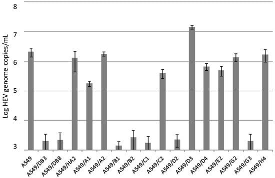 Replication of HEV strain 47832c in clonal cell lines derived from single A549 cells. The HEV genome copy number present in the culture supernatant at 14 days after infection and the standard deviation (error bars) of three replicates each are shown.
