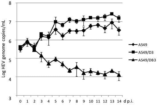 Time-course analysis of HEV strain 47832c replication in A549 cells and in the clonal cell lines A549/D3 and A549/DB3. The HEV genome copy number present in the culture supernatant was analyzed daily and the mean copy number and the standard deviation (error bars) of three replicates each are shown.