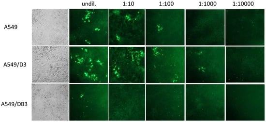 Light microscopy of the cell line A549 and the subclonal cell lines A549/D3 and A549/DB3 showed that they have similar morphologies; however, A549/D3 cells tended to be larger and showed a more structured appearance (Figure 4, left panel). No cytopathic effects were evident after HEV infection for each of the cell lines. Replication of HEV in these cell lines was also analyzed by IFT using an HEV capsid protein-specific antiserum. To this end, the cell lines were infected with ten-fold dilutions of HEV strain 47832c and analyzed at 14 days p.i. Productive HEV infection was evident in case of cell lines A549 and A549/D3 by the presence of fluorescent foci consisting of more than two adjacent cells showing clear cytoplasmatic fluorescence (Figure 4). These foci were consistently present after infection with virus dilutions of up to 1:100 in the cell line A549 and for 1:1000 dilutions in cell line A549/D3. In contrast, only single isolated cells showed fluorescence after infection of A549/DB3 cells with the undiluted virus suspension.