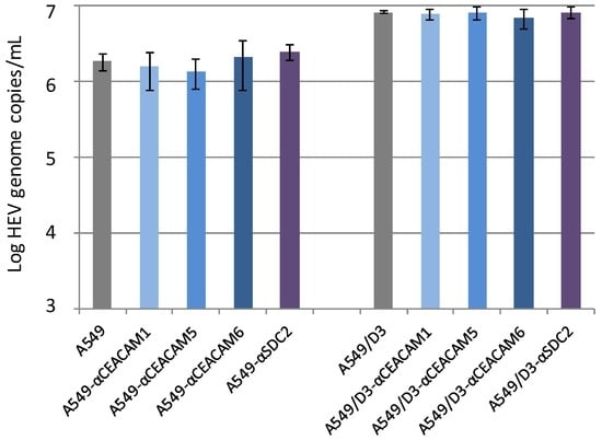 Cells were seeded into 24-well plates and grown for seven days as described above. The medium was exchanged and cells were incubated at 37 °C for additional three days. After two washing steps with PBS, 200 µL/well MEM Eagle medium supplemented with 10 µg of the respective specific rabbit hyperimmune serum was added. CEACAM1-specific (Catalog No. ABIN 1997567), CEACAM5-specific (Catalog No. ABIN 1998195) and CEACAM6-specific (Catalog No. ABIN 1997583) sera were purchased from antibodies-online GmbH (Aachen, Germany). Syndecan 2 (SDC2)-specific antibodies (Catalog No. R30996) originated from NSJ Bioreagents (San Diego, CA, USA). All specific antisera were previously tested negative for HEV-specific antibodies using an enzyme-linked immunosorbent assay (ELISA; AXIOM, Bürstadt, Germany). Control wells received no antiserum. After incubation for 1 h at 37 °C, the solution was removed and replaced by 200 µL HEV-containing culture supernatant (2.4 × 106 genome copies/mL) and incubated at room temperature for 1 h. The virus solution was removed, the cells were washed three times with PBS and culture medium containing 10 µg of the respective antiserum and 5% FCS was added. After incubation for seven days at 34.5 °C, the culture supernatant was removed and replaced by fresh medium containing 10 µg of the respective antiserum and 5% FCS. After additional incubation for seven days at 34.5 °C, RNA was extracted from the culture supernatants and tested by RT-qPCR.