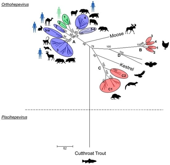The Orthohepevirus C species shares 51.68%–60.57% nt identity with other Orthohepevirus species. Two different genotypes can be distinguished: C1 and C2. Genotype C1 includes strains isolated from rat (Figure 1). However, some variants with incomplete sequences, isolated from bandicoot and Asian musk shrew, cluster also in this genotype [58,59]. The phylogeny analysis of the full genomes available shows three different clusters within this genotype that may constitute three possible subtypes (Figure 1).
