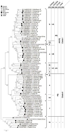 - Clade 3abchij: Within this first clade, HEV strains can be separated into two subclades, 3abj and 3chi, sharing 81.16% to 85.33% nt identity (Figure 2) [35]. HEV strains that cluster in the 3chi subclade share 84.7% to 96.46% nt identity and originate from Europe (France and Germany) and Mongolia. HEV strains within the 3abj subclade share more than 83.75% nt identity. They were isolated in Asia, Europe and North America and are predominantly circulating in Asia and North America. Complete genomes of subtype 3a are from North America and evolutionary studies suggest that it came from Asia and diverged from subtype 3b to subtype 3a in the early 1920s [37,40]. In the subtype 3b, nearly 90% of the full genomes are from Japan, sharing more than 95% nt identity [35,37] (Figure 2). Studies on the origin of HEV in Japan suggest that HEV-3 was imported from Europe in the early 20th century and then diverged into the 3b subtype [37,40]. The subtype 3j was isolated from a pool of pig faecal samples in North America [48], thus, full genome sequences from single animals must be added to validate this subtype [35].