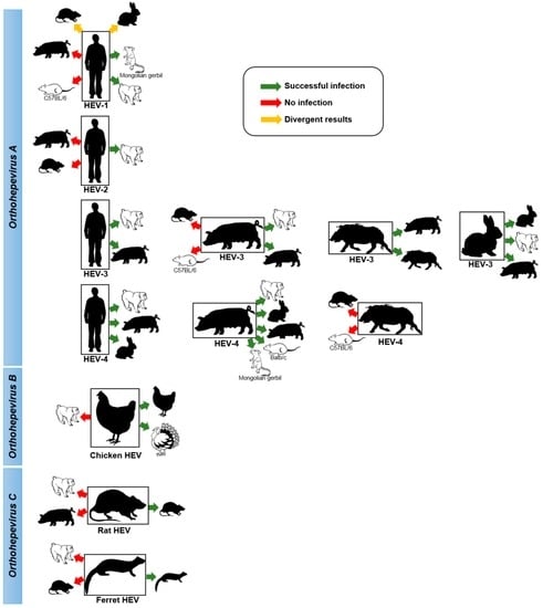 Much effort has then been made recently to develop small animal models to study HEV pathogenesis and inter-species transmission. Mongolian gerbils seem to be a promising model that is easy to handle, cost-effective and can mimic hepatic diseases. However, more studies need to be performed to determine whether this species is susceptible to other genotypes of HEV such as HEV-3 and HEV-7. It is also not clear whether gerbils can be infected via the faecal–oral route and whether transmission studies can be performed in this model. Naturally occurring models such as ferrets could also represent a good alternative. Nevertheless, their susceptibility to human and other HEV strains from the Orthohepevirus A species remains to be determined. The identification of new strains and hosts of HEV might help in the near future to the development of a suitable naturally occurring animal model.