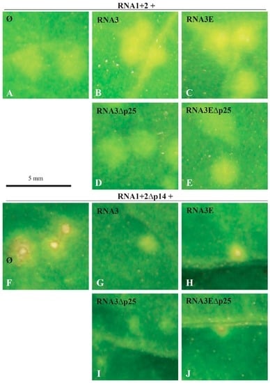 The VSR protein of BNYVV (p14) was shown to be essential for long-distance movement of the virus in Beta species and for the systemic movement of the genomic RNA1 and RNA2 in N. benthamiana []. Upon inoculation of C. quinoa leaves, RNA1 + RNA2 are sufficient to produce green chlorotic local lesions (Figure 1A). RNA3 that contains the coremin sequence is able to drive the accumulation of ncRNA3, while RNA3E possesses the reverse complement sequence and does not accumulate ncRNA3 []. Coexpression of RNA 1 and RNA 2 with RNA3 or RNA3E causes the spots in the leaves to turn yellow (Figure 1B,C). The lesions remained green when p25-deficient RNA3 or RNA3E were present (Figure 1D,E; RNA3∆p25 and RNA3E∆p25, respectively). Inoculation of leaves with RNA1 and p14-deficient RNA2 (p14null mutant, 1 + 2∆p14) leads to the production of small necrotic lesions (Figure 1F). Interestingly, when RNA3 was present, small chlorotic spots were observed without noticeable changes in lesion size (Figure 1G,I). Conversely, no phenotypic change was observed when RNA3E and RNA3E∆p25 were inoculated (Figure 1H,J). This indicates that the symptom attenuation was due to the production of the ncRNA3.
