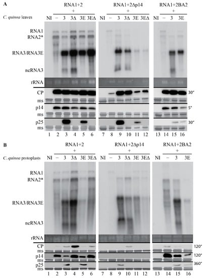 RNA1 and RNA2 (RNA2, RNA2Δp14, or RNA2BA2) species, supplemented or not with RNA3 or RNA3E, served for the mechanical infection of Chenopodium quinoa (C. quinoa) or WT and knockdown RDR6i N. benthamiana leaves [], or the electroporation of C. quinoa protoplasts, as described previously [,,]. RDR6i seeds were kindly provided by D. Baulcombe (Cambridge, UK).