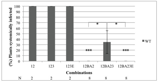 3.3. Silencing of N. benthamiana RDR6 Allows Systemic Movement of VSR BA2 Mutant Independently of the Presence of RNA3
