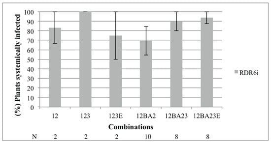 Since p14 was shown to reduce secondary siRNA production in agroinfiltration patch experiments [], we wanted to determine whether this protein interferes with RDR6 as presumed previously [,]. We thus applied inocula of RNA1 supplemented with RNA2 or RNA2BA2 in the presence of RNA3 or RNA3E to RDR6 knockdown plants (RDR6i) and monitored systemic infection. N. benthamiana RDR6i plants were inoculated and analyzed similarly as described above. RNA1 + RNA2∆p14 was not able to move in RDR6i upper leaves, even in the presence of RNA3 (data not shown). Interestingly, all viral RNA combinations were able to move independently of the presence of RNA3 (Figure 4). Statistical analyses using Fisher’s exact test and false discovery rate did not highlight significant differences between the inocula (p-value > 0.05), even if the presence of RNA3 slightly increased the systemic infection. We concluded from this experiment that the knockdown of RDR6 complemented p14BA2 long-distance movement deficiency. Taken together, the results obtained using WT and RDR6i plants indicated a functional role of ncRNA3 on the BNYVV VSR as the presence of RNA3 complemented partially the VSR mutant (compare Figure 3 and Figure 4, 12BA2 and 12BA23). This also suggests that p14 inhibits the effect of the RDR6 pathway, presumably by acting on the production or systemic movement of secondary siRNAs as stated above.