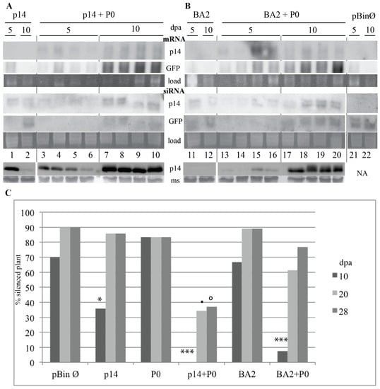 p14 is not stable when expressed outside its viral context [], and its accumulation decreases rapidly (Figure 5A, lanes 1–2). Therefore, we concluded that this transient expression system does not reflect the situation occurring during genuine viral infection. Indeed, during infection, p14 is constitutively expressed. To stabilize p14 mRNA in infiltrated tissues, we decided to co-express p14 in combination with polerovirus P0, a VSR that acts by inducing degradation of Argonaute proteins and does not inhibit the movement of siRNAs [,,]. Using this approach, p14 and p14BA2 protein expression lingered for 10 days (Figure 5A,B, bottom). This was due to the stabilization of the mRNAs (Figure 5A, lanes 3–10 and Figure 5B, lanes 13–20). At 5 dpa, low amounts of anti-GFP and anti-p14 siRNAs were found in the patches but started to accumulate at 10 dpa (Figure 5A, p14 + P0, lanes 3–10); the same observations were made with the p14BA2 mutant (Figure 5B, BA2 + P0, lanes 13–20). Therefore, co-expression of these VSRs did not interfere with the effect of p14, p14BA2, or P0 on the reduction of siRNAs (Figure 5) or secondary siRNA production (data not shown). We concluded that the expression of P0 was able to grant continuous production of p14 under transient expression conditions.
