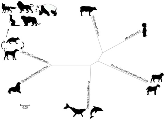 Morbilliviruses belong to the Paramyxoviridae family as a member of the Mononegavirales order. In addition to MeV, CDV, and RPV, the Morbillivirus genus currently includes four species, namely the Cetacean morbillivirus (CeMV), the Phocine distemper virus (PDV), the Peste-des-petits-ruminant virus (PPRV) and the recently added Feline morbillivirus (FeMV). Phylogenetically, the CDV and PDV are the most closely related (Figure 2), suggesting that the PDV emerged from the CDV several thousands of years ago by contact with terrestrial carnivores [7]. The CeMV forms a separate branch that includes isolates from dolphins and porpoises, while the MeV is most closely related to the ruminant morbilliviruses: RPV and PPRV. The RPV has been suggested as the progenitor virus of the Morbillivirus genus [8].