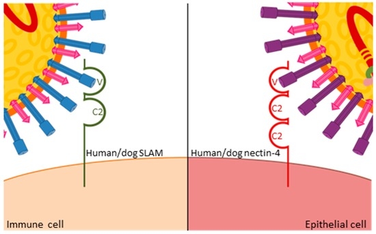 The efficiency of immune recognition by the respective host determines the extent of virus amplification in immune cells and thereby the level of spread to epithelial cells. In ferrets, which are unable to control wild type viruses, infection levels exceeding 80% of B or T cells can be observed in certain immune tissues [24], whereas levels below 10% are usually found in MeV-infected macaques [25]. Consequently, there is a massive infection of epithelial tissues in wild type virus-infected ferrets, leading to severe respiratory and gastro-intestinal signs of disease and death within two to five weeks [16,26], whereas most primates develop only localized infection of epithelial cells and mild clinical signs [25]. Upon the identification of nectin-4—an adhesion protein that also contains immunoglobulin-like domains (Figure 3)—as a morbillivirus epithelial cell receptor [27,28,29,30], nectin-4blind viruses were generated that retained their ability to infect immune cells and resulted in wild type peripheral blood mononuclear cell (PBMC) infection levels and immunosuppression in ferrets. However, no rash or other clinical signs were observed, and no virus was shed [31]. The corresponding MeV in primates also remained immunosuppressive and was no longer shed [32], again illustrating the common role of receptor interactions in both viruses. Furthermore, studies with these selective receptor-blind viruses revealed that immunosuppression is caused by immune cell infection while clinical signs, and likely also transmission, result from epithelial cell infection. This link between specific target cell populations and defined clinical aspects of the disease provides starting points for therapeutic and outbreak control strategies.