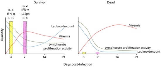 Schematic depiction of immune response profiles associated with different morbillivirus disease outcomes. Survivors display robust innate immune activation and experience transient immune suppression as indicated by a transient drop in leukocytes and lymphocyte proliferation activity upon non-specific stimulation, robust induction of innate and then adaptive cytokine responses, and control of cell associated viremia, while animals that succumb to the disease experience severe leukopenia and complete loss of lymphocyte proliferation activity, and are unable to activate innate immune responses and control the virus. IL: interleukin; IFN: interferon.