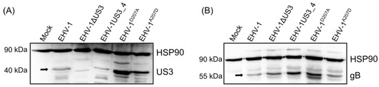 Analysing US3 expression by western blot. Cells were either infected with parental, mutant, recombinant, or revertant viruses. Cell lysates were prepared with radioimmunoprecipitation assay (RIPA) buffer. The pUS3 (A) and gB (B) proteins were separated by 12% sodium dodecyl sulfate-polyacrylamide gel electrophoresis (SDS-PAGE). The expression of pUS3 and gB (black arrows) were detected with anti-US3 and anti-gB antibodies, respectively. Heat shock protein 90 α/β (HSP90α/β, 1:1000 dilution) was used as a loading control