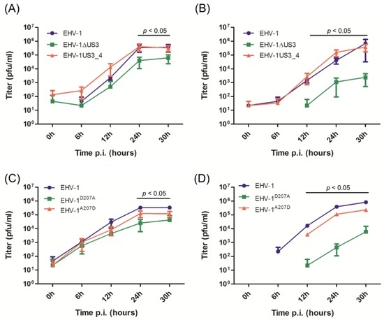 Growth properties of mutant and recombinant viruses. Confluent equine dermal (ED) cells were infected with the different viruses as indicated in the figure. Infected cells (A and C) and supernatant (B and D) were collected separately at different time points post-infection (p.i.; 0, 6, 12, 24 and 30 h) and virus titers were determined. The data presented are means ± standard deviations (SD) of three independent experiments. Significance levels (p < 0.05) were determined for US3-deleted or EHV-1D207A viruses when compared to parental, mutant, recombinant and revertant viruses (Friedman test-Dunn’s multiple comparison test). EHV-1: equine herpesvirus type 1; EHV-1ΔUS3: EHV-1 where US3 has been deleted; EHV-1US3_4: EHV-1 where US3_4 replaces US3_1; EHV-1D207A: EHV-1 with a point mutation in the catalytic active site of pUS3 where aspartic acid was replaced with alanine; EHV-1A207D: EHV-1 revertant virus where the original aspartic acid was restored.