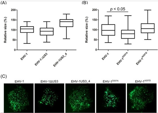 Determination of cell-to-cell spread by plaque size assay. ED cells were infected with EHV-1∆US3 (A) or EHV-1D207A (B) viruses at a multiplicity of infection (MOI) of 0.001. After 72 h, 50 plaques were measured for each virus. The central line in the box plot indicates the median of the data, while the edges of the box indicate the 25th and 75th percentiles. Extending from the box are whiskers, the top whisker expands to the 95th percentile and the bottom whisker to the 5th percentile. The plaque diameter of parental viruses was set to 100%. A significant reduction (one-way ANOVA; p < 0.05) of plaque size for EHV-1D207A was seen when compared to parental, mutant, recombinant or revertant viruses. (C) plaques produced by different green fluorescent protein (GFP)-expressing viruses. Pictures were taken using a Zeiss Axiovert fluorescence microscope.