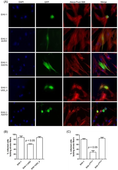 Rearrangement of actin cytoskeleton in infected ED cells. (A) ED cells were infected with parental, US3_1-deleted, EHV-1D207A, US3_4-recombinant, or revertant viruses and imaged by immunofluorescence microscopy using a Zeiss Axiovert fluorescence microscope. Pictures were taken with a 63x oil objective. The nucleus was stained with 4′,6-diamidino-2-phenylindole (DAPI, blue), the actin cytoskeleton was stained with phalloidin-Alexa 568 (red), and the virus-infected cells were visualized through enhanced GFP (eGFP) expression (green). (B and C) A total of 200 infected cells for each virus in three independent experiments were inspected and the percentage of infected cells with or without changes in actin cytoskeleton was calculated. A significant change in actin cytoskeleton rearrangement was detected for either EHV-1ΔUS3 or EHV-1D207A when compared to parental, recombinant, or revertant viruses (one-way ANOVA; p < 0.05).