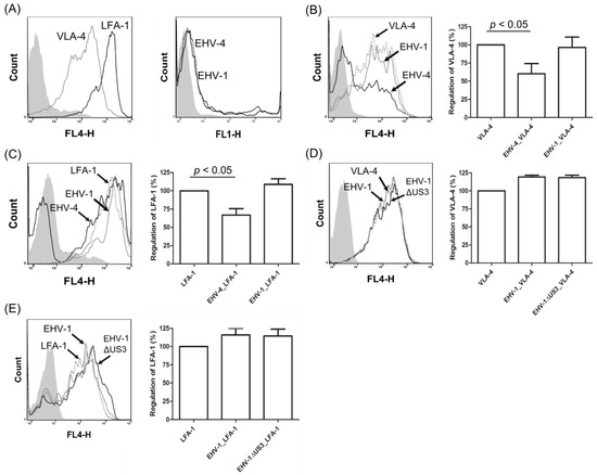 EHV-4 downregulates cell surface adhesion molecules on peripheral blood mononuclear cells (PBMC). (A) surface expression of very late antigen-4 (VLA-4) and lymphocyte function-associated antigen-1 (LFA-1) on the surface of mock-infected PBMC and virus infection (black line: EHV-1; dotted line: EHV-4) levels of PBMC were determined by flow cytometry. (B and C) Equine PBMC were either mock-infected or infected with EHV-4 or EHV-1 and subjected to flow cytometric analysis. Histograms and bars of VLA-4 (B) and LFA-1 (C) expression after detection with the relevant antibodies are shown. Viable cells (10,000) were analyzed for each sample. Grey filled: mock-infected cells; dotted line: mock-infected cells with the relevant antibody; black line: EHV-4-infected cells; grey line: EHV-1-infected cells. For the bars, the expression level of adhesion molecules (VLA-4 or LFA-1) was set to 100%. All data represent the mean ± SD of three independent experiments. A significant downregulation (one-way ANOVA; p < 0.05) of VLA-4 and LFA-1 for EHV-4-infected cells was seen when compared to mock- or EHV-1-infected cells. (D and E) PBMC were either mock-infected or infected with EHV-1ΔUS3 and subjected to flow cytometric analysis. Histograms and bars of VLA-4 (D) and LFA-1 (E) expression are shown. Grey filled: mock-infected cells; dotted line: mock-infected cells with the relevant antibody; grey line: EHV-1-infected cells; black line: EHV-1ΔUS3-infected cells. Data are from one representative experiment out of three. FL1 and FL4: fluorescence detector.