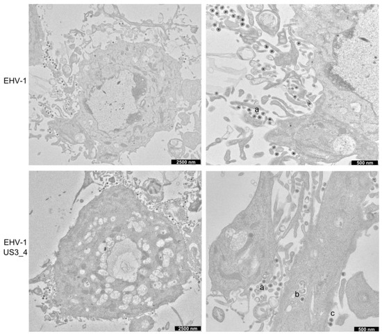 Electron microscopy of ED cells infected with parental and recombinant EHV-1. ED cells were infected for 14 h and analysed by transmission electron microscopy. Cells show different stages of virion maturation, including extracellular virions (a), enveloped virions within cytoplasmic vesicles (b) and primary enveloped virions in the nucleus (c).