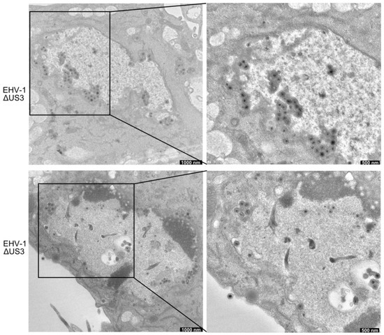 Ultrastructural analysis of ED cells infected with US3-deleted EHV-1. ED cells were infected for 14 h and analysed by transmission electron microscopy. Cells show accumulation of enveloped virions in the perinuclear space.