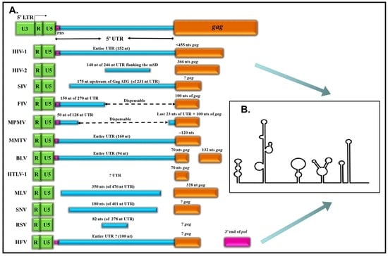 The primary packaging determinants of retroviruses are located at the 5’ end of the viral genome, within the 5’ untranslated region (UTR) and 5’ end of gag. (A) Schematic representation of the location of the packaging determinants within the 5’ UTR and gag for different retroviruses; (B) Generic representation of the higher order structures (stem loops) predicted, biochemically validated, or both at the 5’ end of different retroviruses important for gRNA dimerization and encapsidation. For the sake of simplicity and distinction from long terminal repeats (LTR) sequences, the 5’ UTR in this figure and Table 1 refers to sequences starting from the end of 5’ LTR (and not R) to the beginning of gag gene (excluding the ATG). Figure not drawn to scale. HIV: human immunodeficiency virus; SIV: simian immunodeficiency virus; FIV: feline immunodeficiency virus; MPMV: Mason-Pfizer monkey virus; MMTV: mouse mammary tumor virus; BLV: bovine leukemia virus; HTLV-1: human T-lymphotropic virus type 1; MLV: murine leukemia virus; SNV: avian spleen necrosis virus; RSV: Rous sarcoma virus; HFV: human foamy viruses.