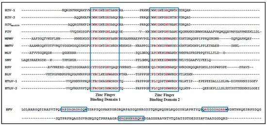 Multiple sequence alignment of the nucleocapsid region of the various Gag proteins of the listed retroviruses. The zinc finger binding domains present in the protein are boxed. The conserved cysteine (C) and histidine (H) amino acids of the zinc finger domains are shown in red. As can be observed, MLV and SNV contain only one zinc finger binding domain. The spumaviruses (e.g., HFV) are unique among retroviruses in that they contain three glycine-arginine-rich boxes instead of the cysteine-histidine-containing zinc finger domains []. Dashes have been added to facilitate the alignment of the differently sized nucleocapsid proteins.