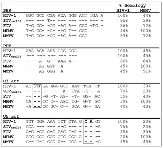 Overall, Table 2 shows that, if a viral RNA could be cross-packaged, nearly 60% of the time it could also successfully propagate and transduce the target cells. However, there were exceptions. For example, the most promiscuous lentiviruses, HIV-1, SIV, and FIV, could cross-package each other’s RNAs and propagate them successfully; they could also cross-package MPMV (a non-lentivirus) RNA as well, but all three lentiviruses were unable to propagate the cross-packaged MPMV RNA into the target cells [,]. Similarly, MPMV proteins could cross-package HIV-1 and SIV RNAs (though not FIV), but could not propagate these RNAs further, pointing towards the incompatibility of the MPMV reverse transcriptase and integrase enzymes with the cis-acting sequences of the heterologous (HIV-1 and SIV) viral RNAs. A comparison of the cis-acting sequences important for viral RNA propagation among HIV-1, SIV, FIV, and MPMV revealed size differences in the length of PBS and PPT (shorter for MPMV than the lentiviruses) as well as the least homology of the MPMV att sites compared to HIV-1, SIV, or FIV (Figure 3). These observations suggest that incompatibility between FIV reverse transcriptase and integrase enzymes with that of MPMV PBS, PPT, and att sites is the likely reason for the inefficient RNA propagation observed between MPMV and the lentiviruses. Similar observations have been reported when HIV-1 att sites were substituted by those from FIV in HIV-1 RNA, resulting in only a one-third reduction in integration efficiency, while substitution with the more distantly related MLV att sites led to nearly a complete abrogation of integration of the hybrid HIV-1 RNA [].