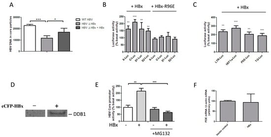 HBx expression is essential for HBV replication in vivo, but in HepG2 cells viral replication is possible, although it is attenuated, in the absence of HBx [,,,,,,,]. We induced HBV replication in HepG2 cells by transfection of the R9 and the R9ΔHBx vector, which contain 1.2 copies of the HBV genome and initiate HBx proficient and HBx deficient replication, respectively. We assessed the intracellular production of encapsidated HBV DNA to determine HBV replication efficiency [,]. Regarding the attenuated replication after transfection of R9ΔHBx, HBV replication could be restored by cotransfection of our pHSV-HBx vector, showing that functional HBx is expressed from this vector [] (Figure 1A). The promoter-independent transactivation of transfected luciferase reporters can be used to assess HBx functionality [,,]. To investigate under which conditions HBx can transactivate transcription in HEK 293 cells, we transfected HEK 293 cells with luciferase reporters. Cotransfection of an HBx-expressing construct significantly increased the transcriptional activity of luciferase reporters under control of the endogenous HBV promoters (Figure 1B) and several unrelated promoters (Figure 1C). Transactivation by HBx did not depend on the promoters’ basal activity (Figure S1A) or the presence of HBV enhancer 1 (Figure S1B), and maximum transactivation was already reached by the lowest HBx concentration tested (Figure S1C–E). Although HBx interacted with DDB1 in HEK 293 cells (Figure 1D). The well described HBx-R96E mutant, which does not interact with DDB1, failed to transactivate luciferase reporters in HEK 293 cells (Figure 1B and Figure S1B–E). HBx also failed to transactivate promoters in the presence of proteasome inhibitor MG132, confirming that proteasomal degradation is required for transactivation by HBx [] (Figure 1E). While HBx efficiently transactivated a PDE8A promoter-driven luciferase reporter, we found that PDE8A mRNA levels were not affected by HBx, indicating that transcription from the chromosomal promoter was not affected (Figure 1F). These findings indicate that in HEK 293 cells, as in hepatoma-derived cell lines [], the transcriptional transactivation by HBx is specific for extrachromosomal templates and involves the proteasomal degradation of a host protein.