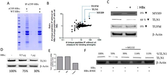Previously, the Smc5/6 complex was identified as a host factor targeted by HBx by means of coprecipitation of HBx-interacting proteins with a fusion construct of HBx and DDB1 proteins that were pro- and deficient in interacting with Cul4A []. To identify other HBx-interacting proteins for further analysis, we generated a eCFP-HBx fusion protein. While eCFP-HBx was efficiently expressed (Figure S2A), it did not transactivate transcription from extrachromosomal templates in HEK 293 cells (data not shown). When eCFP-HBx was precipitated using an anti-GFP antibody that interacts with eCFP, we observed that the eCFP-HBx fusion protein could still coprecipitate the HBx interacting protein DDB1 (Figure 1D). These results indicate that the eCFP-HBx fusion protein may still interact with the protein targeted for degradation, but that steric hindrance of the eCFP protein would prevent the formation of the HBx–DDB1–Cul4 complex required to induce its proteasomal degradation. To further test this hypothesis, we analysed all proteins precipitating with eCFP-HBx. To identify the putative target of HBx, interacting proteins were precipitated with eCFP-HBx in the presence and absence of wild-type HBx, reasoning that this protein should be enriched in cells not coexpressing wild-type HBx. eCFP-HBx coprecipitating proteins were separated by sodium dodecyl sulfate polyacrylamide gel electrophoresis (SDS-PAGE) and visualized by colloidal blue staining (Figure 2A). We analysed all proteins that precipitated with eCFP-HBx using mass spectrometry. Peptides from 2376 (MaxQuant analysis, Table S1) and 2885 (Proteome Discoverer analysis; see Table S2) proteins were identified. Of the identified proteins, heat shock 70 kDa protein 1A/1B (HSP1A/HSP1B), which was previously described to interact with HBx [], was the protein that most abundantly coprecipitated with eCFP-HBx in both conditions (Figure S2B). For several proteins the number of identified peptides was enriched in the immunoprecipitation in the absence of wild-type HBx (Figure 2B and Figures S2B,C). This suggested that these proteins are possible targets for HBx–DDB1-mediated degradation. The three proteins that were most enriched in the absence of wild-type HBx and for which more than 10 unique peptides were detected, were selected for further analysis: myosin heavy chain 9 (MYH9), TLN1, and elongation factor Tu, mitochondrial (TUFM). We observed that wild-type HBx expression in HEK 293T cells did not induce the degradation of MYH9 or TUFM. This suggests that wild-type HBx may compete with eCFP-HBx for binding to MYH9 and TUFM, but that wild-type HBx did not induce their proteasomal degradation (Figure 2C). When we expressed HBx in HEK 293T cells, we observed a reduction in TLN1 protein levels (Figure 2C). TLN1 was previously found to interact with HBx []. TLN1 degradation by HBx was confirmed in additional experiments, though TLN1 degradation required relatively high levels of HBx expression (Figure 2D). TLN1 mRNA expression levels were not affected by HBx expression, showing that the decrease in TLN1 level results from increased proteasomal TLN1 degradation (Figure 2E). Expression of the HBx-R96E mutant did not affect TLN1 levels, and the addition of proteasome inhibitor MG132 prevented HBx-mediated TLN1 degradation (Figure 2F). This confirms that HBx needs to interact with DDB1 to induce proteasomal degradation of TLN1. In addition, the levels of TLN2, which is highly homologous to TLN1 (74% amino acid sequence identity), were not affected by HBx expression (Figure S3A).