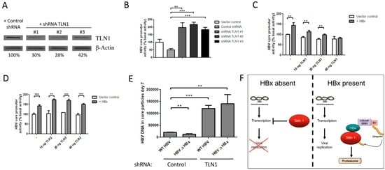 Chronic infection with HBV is the major aetiological agent associated with hepatocellular carcinoma (HCC), and various lines of evidence suggest that HBx is involved in oncogenic transformation. In HCC, HBx is frequently expressed from chromosomally integrated HBV DNA fragments [], and several transgenic mouse models that express HBx in their livers spontaneously develop HCC [,]. TLN1 is frequently overexpressed in various types of cancer, and serum TLN1 levels have been associated with HCC progression. Interestingly, the amount of TLN1 in HCC tissue varies. TLN1 expression correlates with HCC dedifferentiation []. Notably, HBV replication is inversely correlated to the hepatocyte differentiation state [].