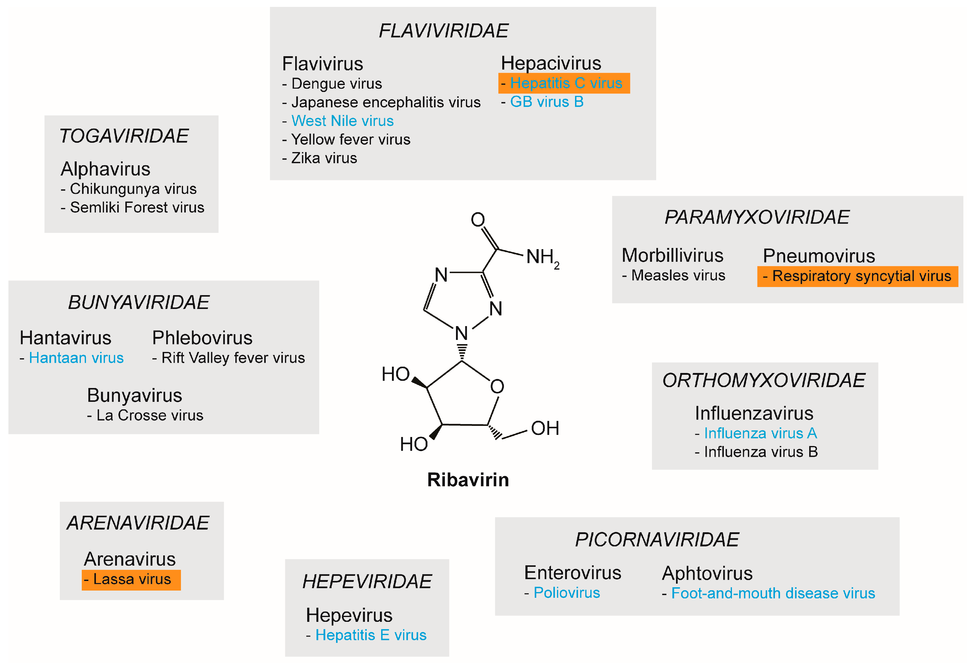 Taken together, since its first description as an antiviral in 1972, RBV has been shown to be active against a broad range of RNA viruses. However, due to limited clinical trial data supporting its in vivo efficacy, clinical applications are currently limited to a minority of viruses.