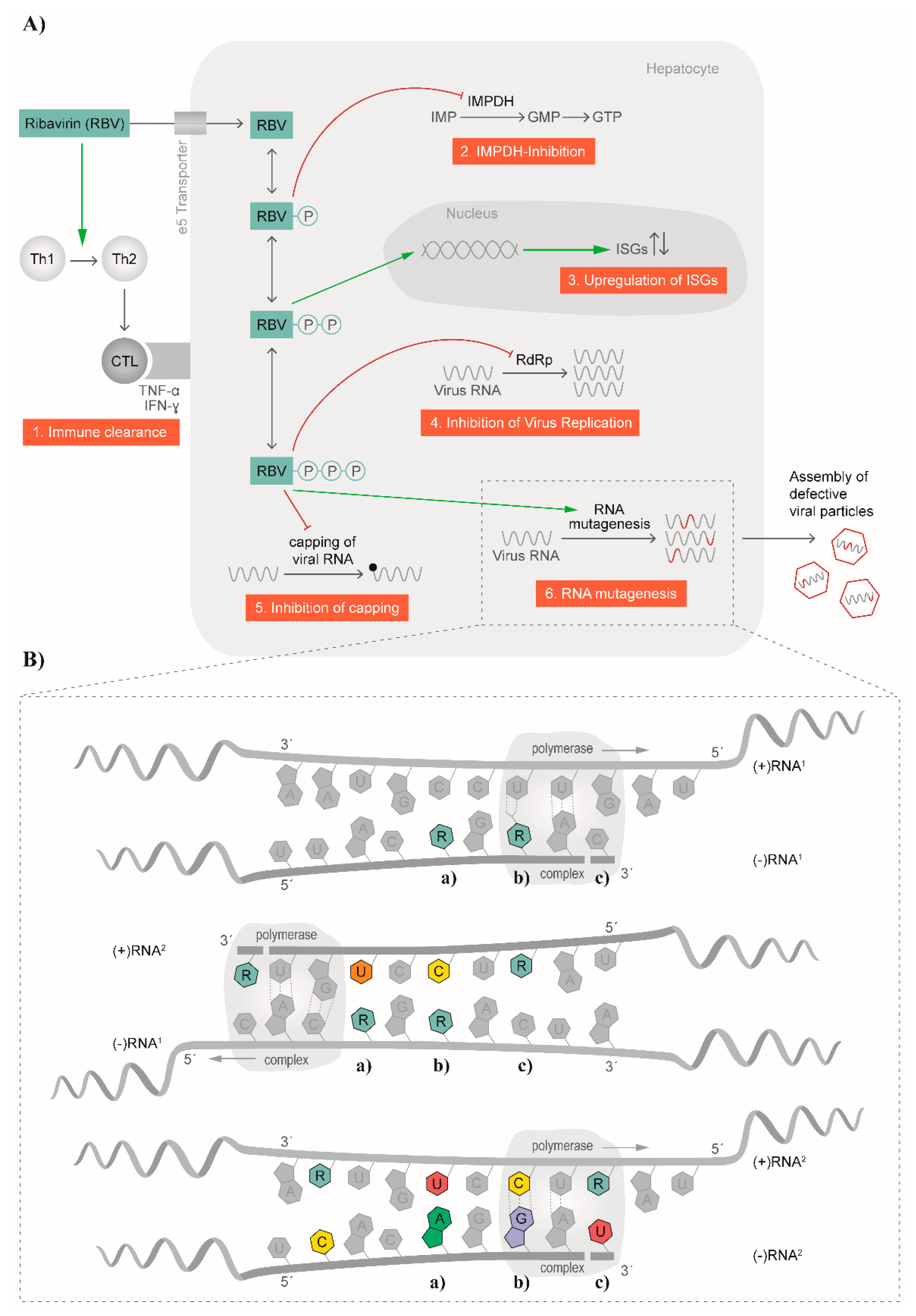 In summary, several mechanisms have been postulated for RBV activity. Among these, there are indirect, immunomodulatory mechanisms and effects on IMPDH. Furthermore, mechanisms on the virus itself were described by inhibition of the capping efficiency, the viral polymerase, and a mutagenic effect on newly synthesized RNA genomes.