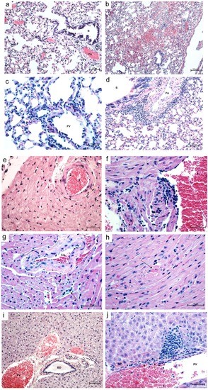 At necropsy, organs of all deer mice appeared normal upon gross examination. Histopathologic lesions were detected in the lungs, liver, heart, and salivary glands of all infected animals to varying degrees (Figure 2, Table 1). At days 2, 4, and 56 PI, at least one infected deer mouse showed congestion of alveolar capillaries with multifocal pulmonary hemorrhages and minimal perivascular infiltrates of mixed inflammatory cells, predominantly neutrophils. Variable amounts of proteinaceous edema fluid filled small numbers of alveoli with occasional suspended macrophages. Severity of the lesions peaked at day 7 PI, especially in the lungs, heart, and liver. Peribronchiolar and perivascular neutrophilic infiltrates were prominent with minimal-to-mild interstitial pneumonia at 7–14 days PI. During the same time frame, the liver showed periportal infiltrates of mixed inflammatory cells, predominantly lymphocytes. Lesions in the heart were detected between 7 and 56 days PI and consisted of individual cardiomyocyte degeneration and mild lymphocytic interstitial myocarditis in the vicinity of affected cardiomyocytes. Occasionally, there was slight hypertrophy and hyperplasia of the endothelial lining of the left atrial endocardium and coronary vessels with subendothelial lymphocytic infiltrates into subjacent myocardium 7 days PI.