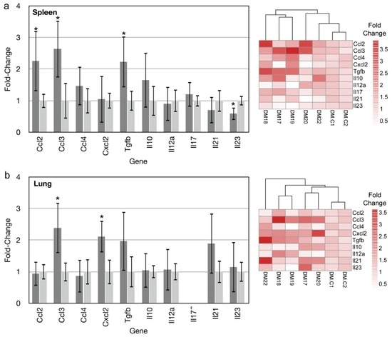 Cytokine and chemokine gene expression in spleens and lungs of MAPV-infected deer mice. Fourteen days post infection, spleens and lungs of 5 deer mice were examined for the expression of 10 genes by real-time PCR. Ccl2, Ccl3 and Tgfb were elevated in spleens of infected deer mice (dark gray) compared to uninfected deer mice (light gray), whereas Il23 expression was repressed. Error bars represent 95% confidence intervals and those denoted by * are statistically different from the uninfected control. Heat map indicates fold-change of individual deer mice used in generating the graph of infected deer mice (DM17–DM22) and uninfected controls (DM.C1, DM.C2) (a). In lungs, only Ccl3 and Cxcl2 were elevated. Heat map indicates fold-change of individual deer mice used in generating the graph of infected deer mice (DM17–DM22) and uninfected controls (DM.C1, DM.C2). **Il17 was not detected in either infected or uninfected lung samples (b).