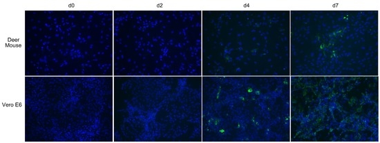 Sera from the infected deer mice were diluted 1:20 in 2% FBS–DMEM, then diluted log2 in final volumes of 100 μL [18]. MAPV was diluted to 103 TCID50/mL and 100 μL added to the serial serum dilutions (1:2 dilution) and incubated for 1 h at room temperature. The 200 μL volumes were then pipetted onto Vero E6 cells monolayered on cover slips in 24-well plates and incubated for 1 h at 37 °C, followed by the addition of 800 μL of 2% FBS–DMEM. Plates were incubated for 7 days, then fixed in 2% buffered formalin, followed by detection of viral antigen using rabbit anti-SNV nucleocapsid-specific antiserum. Goat anti-rabbit IgG–FITC conjugate was incubated for 2 h. Coverslips were mounted on microscope slides with DAPI (ProLong Gold, Life Technologies, Foster City, CA, USA) for visualization by fluorescent microscopy. The reciprocal of the greatest dilution of serum that blocked infection was considered the endpoint titer.