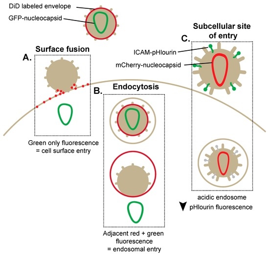 Fluorescent human immunodeficiency virus type 1 (HIV-1) vectors enable the visualization of alternative methods of HIV-1 cell-free entry. (A) Dialkylcarbocyanine analogue (DiD)-labeled HIV-1 expressing green fluorescent protein (GFP)-tagged nucleocapsid identifies viral fusion at the plasma membrane. Plasma membrane fusion corresponds to a loss of red fluorescence due to diffusion of the DiD probe in the plasma membrane and the subsequent presence of green fluorescence; (B) Endosomal entry of HIV-1 is marked by red and green puncta within the cell as DiD probe diffusion is limited to the smaller endosomal location. Viral entry through an endosome is detected by the visualization of a green signal (GFP-tagged nucleocapsid) migrating away from a red signal (DiD-labeled endosome); (C) pH-dependent HIV-1 entry can be measured by incorporation of an intracellular adhesion molecule 1 (ICAM)-pHlourin-labeled HIV-1. The decrease of pHlourin fluorescence corresponds to the presence of HIV-1 within the increasingly acidic endosomal compartment.
