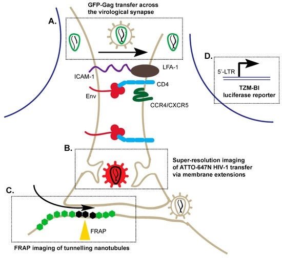 Techniques to visualize cell–cell transmission of HIV-1 through virological synapses and tunneling nanotubules. Upon engagement of Env with cluster of differentiation 4 (CD4) and C-C chemokine receptor type 4/ C-X-C chemokine receptor type 5 (CCR4/CXCR5), there is a recruitment of host cellular factors including ICAM-1 and leukocyte function-associated antigen 1 (LFA-1) to form the virological synapse. (A) 3D-confocal microscopy enables the visualization of GFP-Gag (green) particles across the virological synapse; (B) Super-resolution imaging of ATTO-647N (red) demonstrated that labeled HIV-1 can be taken up by a neighbouring cell though protruding membrane extensions within the virological synapse; (C) Fluorescence recovery after photobleaching (FRAP) studies enable imaging of the dynamics of membrane proteins in live cells to investigate the structure of tunneling nanotubules. Hexagons represent membrane proteins; bleached: black, fluorescent: green; (D) Co-culture of infected primary cells with TZM-Bl cells can be used to detect cell–cell transfer of HIV-1 by β-galactosidase activity, which is expressed under the regulation of the HIV-1 promoter; LTRs (long terminal repeats) are DNA sequences used by retroviruses to integrate into the host genome.